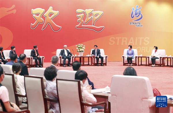 6月17日,第十五届海峡论坛大会在福建厦门举行。中共中央政治局常委、全国政协主席王沪宁出席,宣读习近平总书记贺信并致辞。这是大会开始前,王沪宁会见参加论坛的台湾嘉宾代表。 新华社记者 刘卫兵 摄