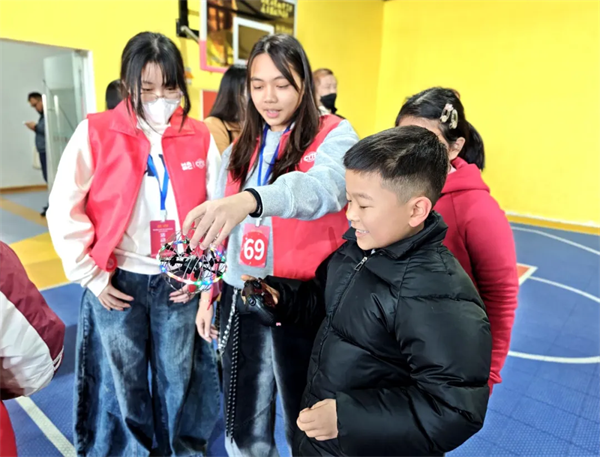 隔壁的无人机竞技赛场同样精彩纷呈。一架架无人机如灵动的飞鸟,精准完成绕桩、爬升、360度旋转等高难度动作。“赛前只磨合了半小时,没想到飞得还挺顺利。”参赛选手陈同学兴奋地说,操控无人机需灵活应对气流干扰,唯有通过多次尝试,才能提升飞行技巧。