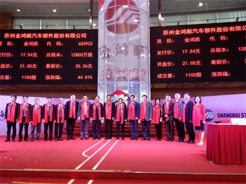 江苏省台办政府网站10月23日讯 今天上午,江苏台资企业-苏州金鸿顺汽车配件股份有限公司在上海证券交易所鸣锣上市,正式登陆上交所主板,成为全省第10家在大陆上市的台资企业,江苏省台办打造“大陆资本市场江苏台企板块”行动计划迈出坚实一步。