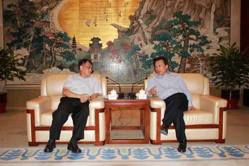 图为连云港市委书记李强(右)会见来连考察的台湾“中国石油学会”理事长、原台湾中油股份有限公司董事长朱少华一行