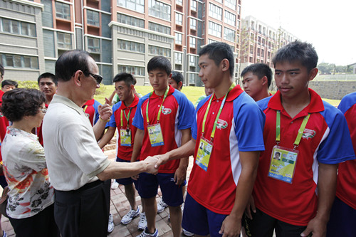 8月16日上午,中国国民党副主席林丰正一行前往位于南京浦口的亚青村,看望参加第二届亚洲青年运动会的中华台北体育代表团,勉励参赛选手取得好成绩。栾铁虹 摄影