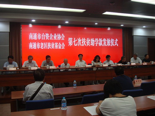 江苏与台湾网8月25日讯 8月22日上午,南通市台湾同胞投资企业协会与南通市老区扶贫基金会在市行政中心第二会议室举行了第七次扶贫助学款发放仪式,发放助学金21.9万元,63名大学生、30名高中生受助。