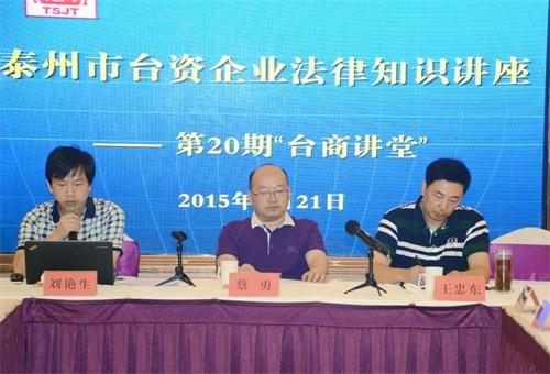 江苏省台办网站8月26日讯 近日,泰州市台办举办第20期“台商讲堂”活动,联合泰州中级法院,邀请泰州胜泰律师事务所的知名律师为台资企业开展法律知识讲座,共计50余家台资企业的负责人参加活动。