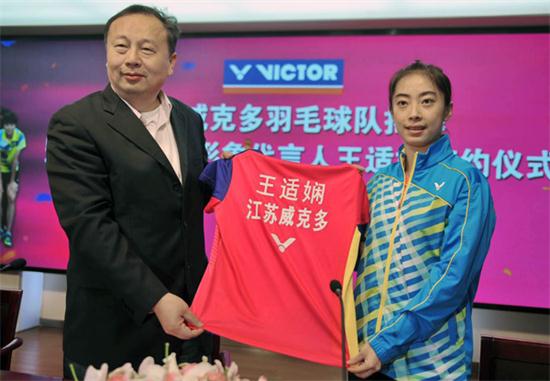 江苏省台办政府网站2月23日讯 2月20日,江苏威克多羽毛球队揭牌暨VICTOR全球形象代言人世界冠军王适娴签约仪式在南京体育学院举行。南京市台协副会长、冠名赞助企业南京胜利体育用品实业有限公司总经理陈庶元和世界冠军王适娴签订全球形象代言人合约并赠予战袍。