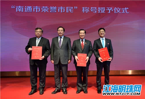 江苏省台办政府网站25日讯 5月23日晚,南通新区会议中心内,群贤毕至、高朋满座。“南通市荣誉市民”称号授予仪式暨“海外知名侨商南通行”欢迎会在这里隆重举行。李昌钰、杨耀忠 、李政宏、汤玛斯·肯瑟勒等4人被授予“南通市荣誉市民”称号,南通市委副书记、代市长徐惠民为荣誉市民颁发证书和奖牌。来自世界20多个国家和地区的杰出侨商、侨领近180多人参加活动。