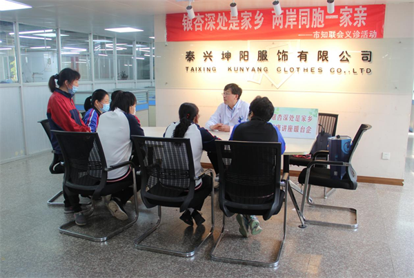 “心知心”的慰问,寄托血浓于水的深情。活动期间,泰兴市委统战部、市台办、市知联会相关负责同志走进生产车间,认真倾听企业生产经营情况,详细询问企业在生产生活中的困难,并送上了防疫慰问包。泰兴坤阳服饰有限公司负责人江如乾表示,这次的健康义诊活动,让我们切身感受到来自“娘家人”的温暖,今后会继续融入地方振兴发展。