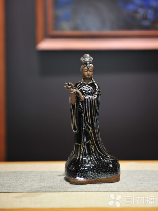 当天展出的《妈祖像》更是韵味十足,邱鹏在福建莆田湄洲岛妈祖庙参学中获得灵感后,与专门研究妈祖文化的专家共同研究文化服饰及神韵等细节,历时数月,采用建盏原材及传统工序烧制而成,作品神态细腻、栩栩如生。