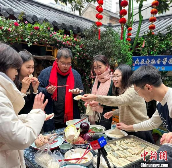 两岸年轻人在包春卷。 中新网记者 朱晓颖 摄
