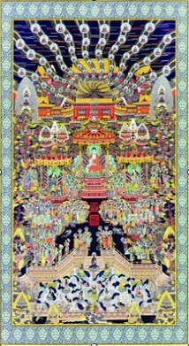 展示在苏州丝绸博物馆的宋锦《西方极乐世界》图轴,宽1.72米,长3.86米,分成上段、中段、下段三部分,整个图轴以阿弥陀佛为中心,278尊佛像神态各异,栩栩如生。整个画面祥云缭绕、宫殿巍峨、宝池树石、奇花异鸟,数十种彩色丝线显花活色生香、巧夺天工。