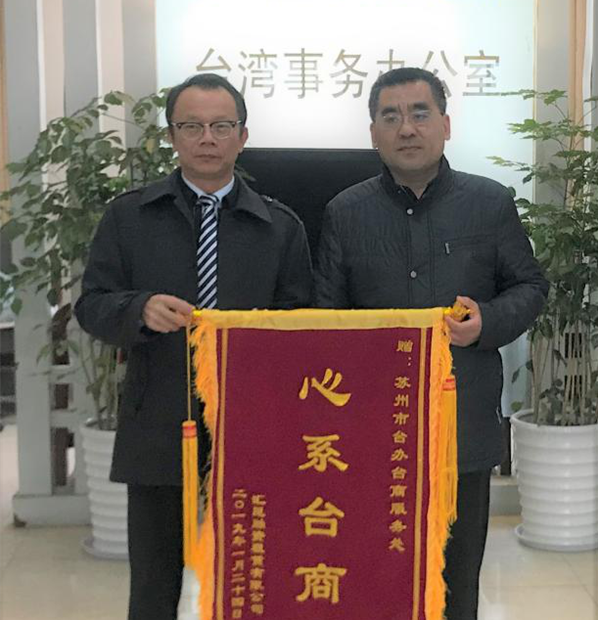 江苏省台办政府网站1月31日讯 29日,汇昆融资租赁有限公司总经理林银士先生专程向苏州市台办赠送“心系台商”锦旗,感谢市台办对企业的贴心服务。
