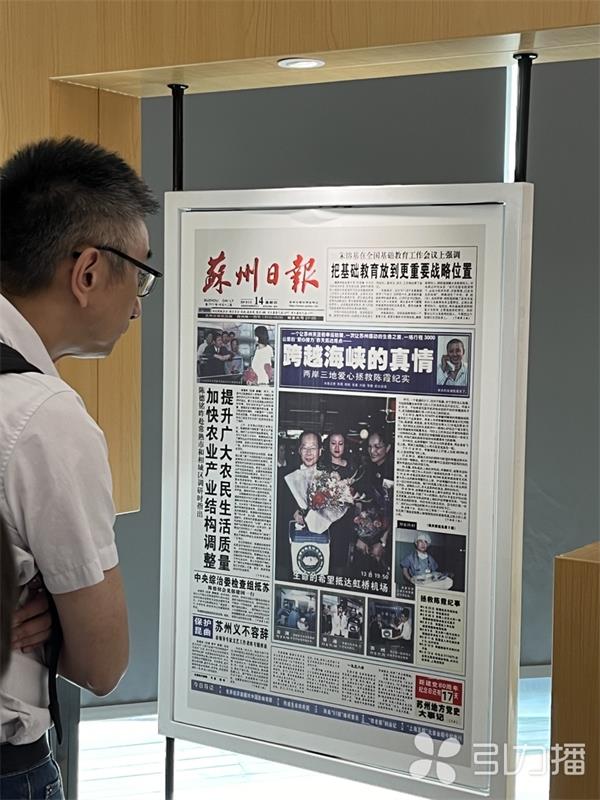 江苏省台办政府网站6月21日讯 近日,在苏州日报社报史馆里,一张放大版的版面紧紧抓住了台湾《联合报》新闻部副内容长王茂臻的目光。他驻足良久、细细观看,还掏出手机,拍下了这幅版面。