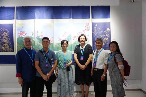 在“梅郎故里·翰墨芳华”泰台书画艺术展上,台湾观自在工笔画苑的于披霞团队带来了“五福临门”和“金龙耀中华”两组中国传统工笔绢画作品。于披霞讲述了此次参展的一个小插曲,“五福临门”原为5幅既相对独立、又环环相连的莲花图组成,取“心手相连”之意。由于该作品一年前已预定在此期间赴美国参展,面对时间上的冲突,团队一致认为还是祖国重要,因此仅抽出5幅中的1幅赴美参展,其余4幅带来祖国大陆。于披霞说,两岸都是龙的传人,借这两组作品表达两岸同胞心手相牵、中华民族伟大复兴的祝福。