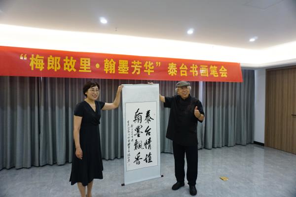 在“梅郎故里·翰墨芳华”泰合书画艺术笔会上,台湾江苏同乡会理事长杨松寿等合湾画家向主办方捐赠了以文化周为主题创作的书画作品。杨松寿作为岛内有影响的书画艺术家,近年来牵头组织了四届泰台书画艺术交流活动。他动情地讲述了自己与泰州的书画情缘,希望两岸书画家以笔会友、相互交流,增进友谊,共同弘扬两岸一脉相承的中华文化,不断增进两岸血浓于水的同胞亲情.