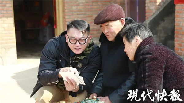 寻亲台胞邱庆龄与舅舅周心和一家看老照片回忆过去。(图片来源:现代快报)