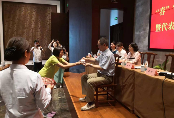 江苏省台办政府网站7月3日讯 7月1日上午,扬州市国医书院内一场中医拜师仪式正在隆重举行,在扬州市台办、市卫健委、市文广旅局等部门的见证下,来自台北毕业于广州中医药大学的台医彭台贞向扬州市中医院殷鸿主任医师鲜花、敬茶、呈拜师贴、行谢师礼,正式成为其亲授传承弟子。