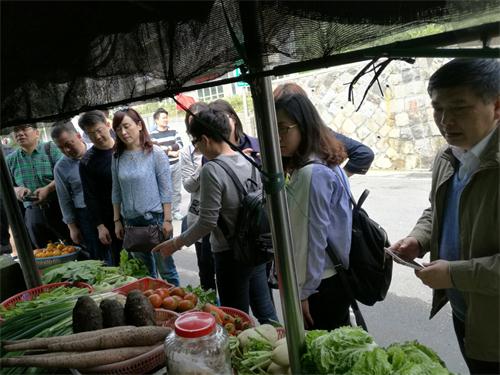 交流团在新北市三芝区,与当地菜农亲切交流,寻问收入和生活情况。
